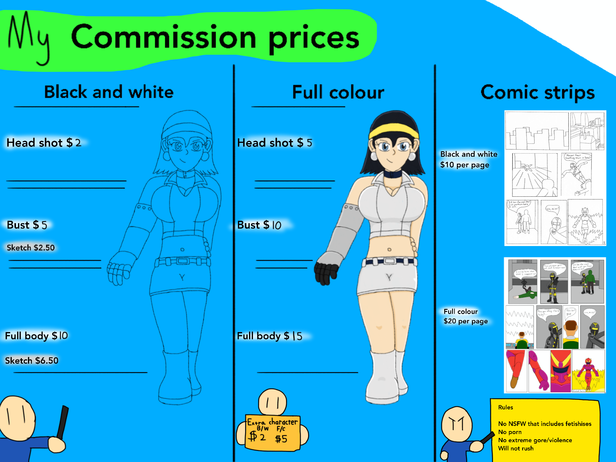 This contains examples of images completed on a commission basis in addition to a general list of prices that can be viewed for those interested in paying for services.